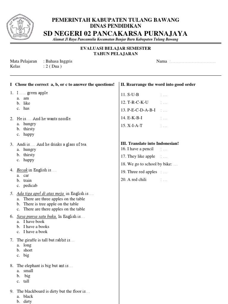 Soal bahasa inggris kelas 2 semester 1. We did not find results for: Check spelling or type a new query. Maybe you would like to learn more about one of these?